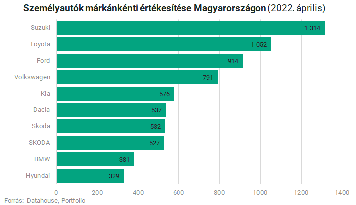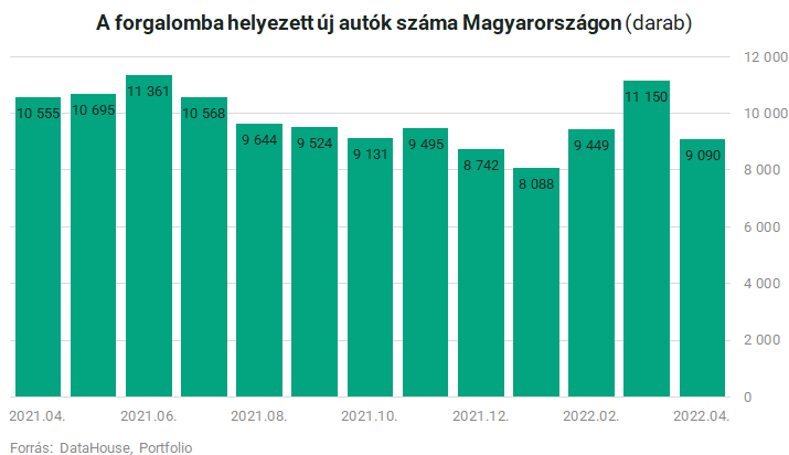 Áprilisban folytatódott a visszaesés a magyar autópiacon, 9090 új autót helyeztek forgalomba, amely 13,9 százalékos csökkenést jelentett 2021 azonos időszakához képest. Év eleje óta 37 780 személyautó került forgalomba, amely 11,6 százalékos csökkenést jelent 2021 első négy hónapjához képest.