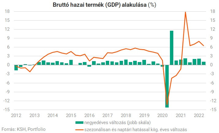 A második negyedévben 6,5%-kal nőtt a magyar gazdaság az előző év azonos időszakához képest a KSH előzetes adatai alapján, amire az első negyedéves 8,2%-os bővülés után lassult a növekedés. A Portfolio által megkérdezett közgazdászok 6,1%-os bővülésre számítottak, így az adat pozitív meglepetést jelent. Negyedéves alapon 1,1%-kal nőtt a GDP, ami szintén kedvező teljesítményről árulkodik. Az év második felében éves alapon a mostaninál lassabb növekedés várható, a nagy kérdés pedig az, hogy negyedéves alapon elfogy-e a lendület, és recesszióba csúszik-e a magyar gazdaság. A növekedést övező kockázatok (magas hazai infláció, emelkedő áram- és gázár, a hitelezés megtorpanása, európai gázválság) alapján nem lenne meglepő a visszaesés.