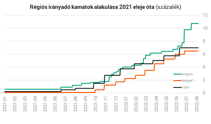 A 10,75 százalékos magyar kamatszint változatlanul a legmagasabb a régióban, a cseheknél jelenleg 7 százalék, a lengyeleknél pedig 6,5% az irányadó ráta.
