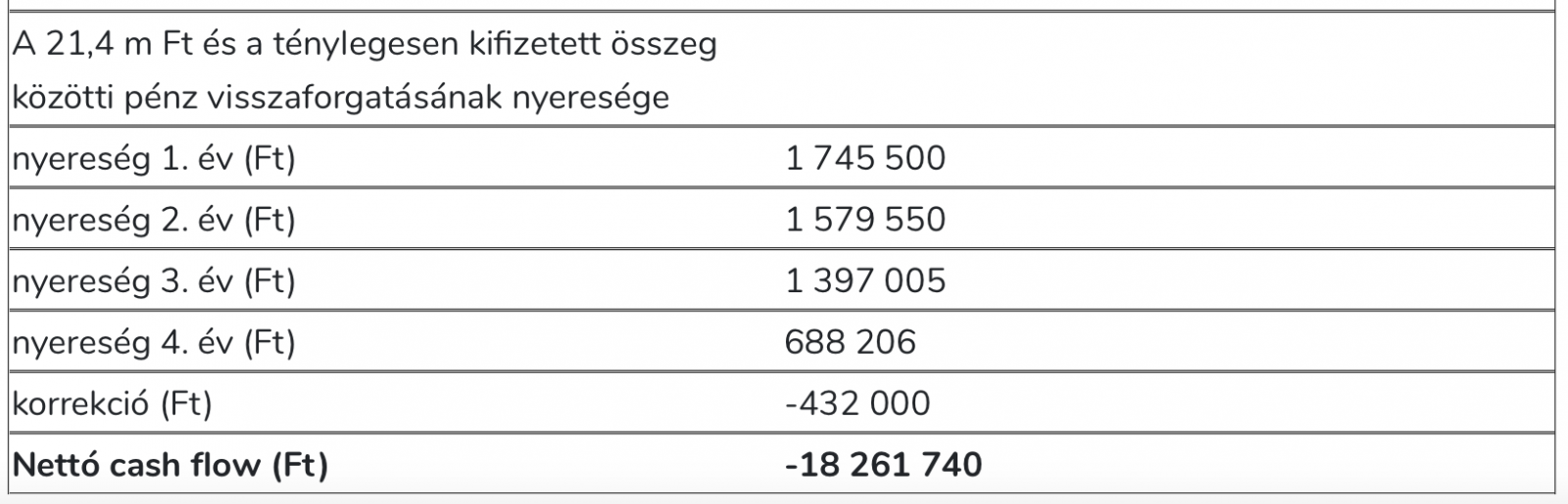 - a 21,4 millió forint és a lízing során kifizetett összeg közötti részt visszaforgatja a vállalkozásába 10% profittal;
