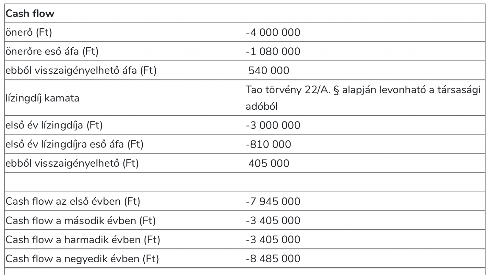 - Az első évben lévő cash flow úgy jön ki, hogy az önerő összege és 12 hónapnyi lízingdíj összeadásra kerül, valamint az áfa 50%-a. A kamat és az áfa másik részét nem számoljuk kiadásként, hiszen az levonásra tud kerülni.