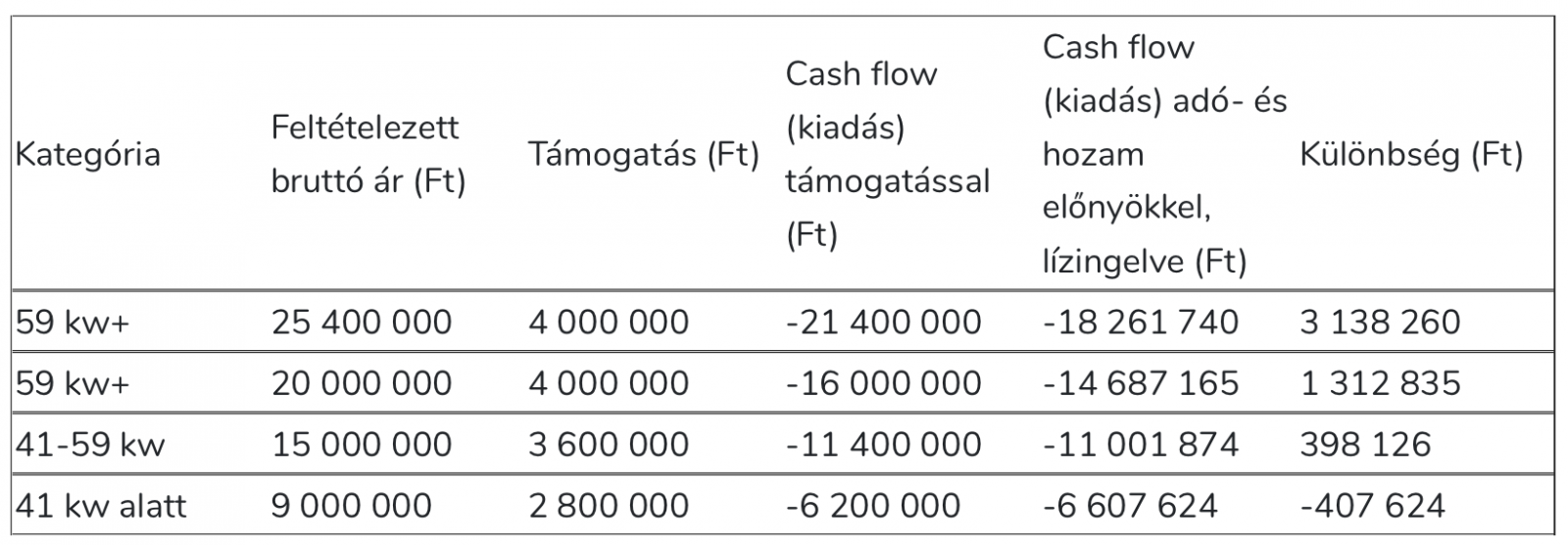 A táblázatokat végig számolva a különböző kategóriákon és árszintek mellett jól látható, hogy matematikailag egyáltalán nem éri meg a 4 millió forintos támogatásra menni. A középső kategóriában már véleményes, hogy valaki akar-e extra papírmunkát, hitelszerződést kötni mindössze 400 ezer forint előnyért cserébe. Az viszont egyértelműen látszik, hogy a 41 kw alatti kategóriában – feltételezve egy 9 millió forintos autót igenis megéri pályázni. Az adókedvezményt csak a KKV-k tudják igénybe venni, akik a társasági adózás alapján adóznak - a kivás vagy egyéni vállalkozók ezt nem tudják igénybe venni. Még amellett sem szabad elmenni, ha valakinek éppen nem áll rendelkezésre az elektromos autó teljes ára, ami a pályázat sikeres megvalósításának egyik feltétele, akkor tudja azt, hogy vannak alternatívák, ahol ugyanazt az eredményt tudná elérni.