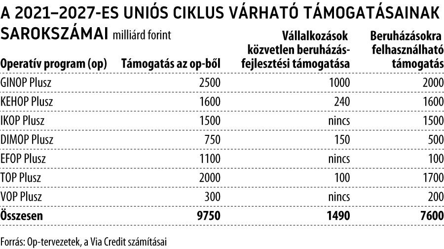 A 2021–2027-es pályázati ciklusban mintegy 9750 milliárd forint támogatásra lehet számítani, ebből közvetlenül a vállalkozások beruházásaira vagy fejlesztésére 1490 milliárd költhető az operatív programok tervei szerint.