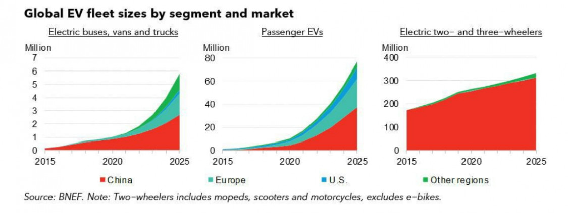 Egyes régióban persze ennél is gyorsabb lehet a haladás: Kínában az EV-k az összes forgalomban lévő jármű 13%-át, Európában pedig 8%-át teszik ki várhatóan 2025-ben.