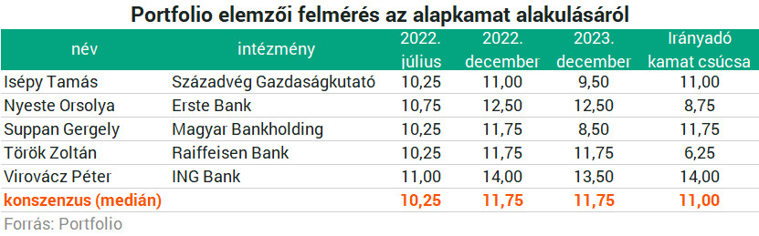 A Portfolio által megkérdezett elemzők többsége most további 50 bázispontos emelésre és 10,25%-os alapkamatra számít, majd csütörtökön várhatóan ugyanarra a szintre emelkedik az egyhetes betéti ráta is.